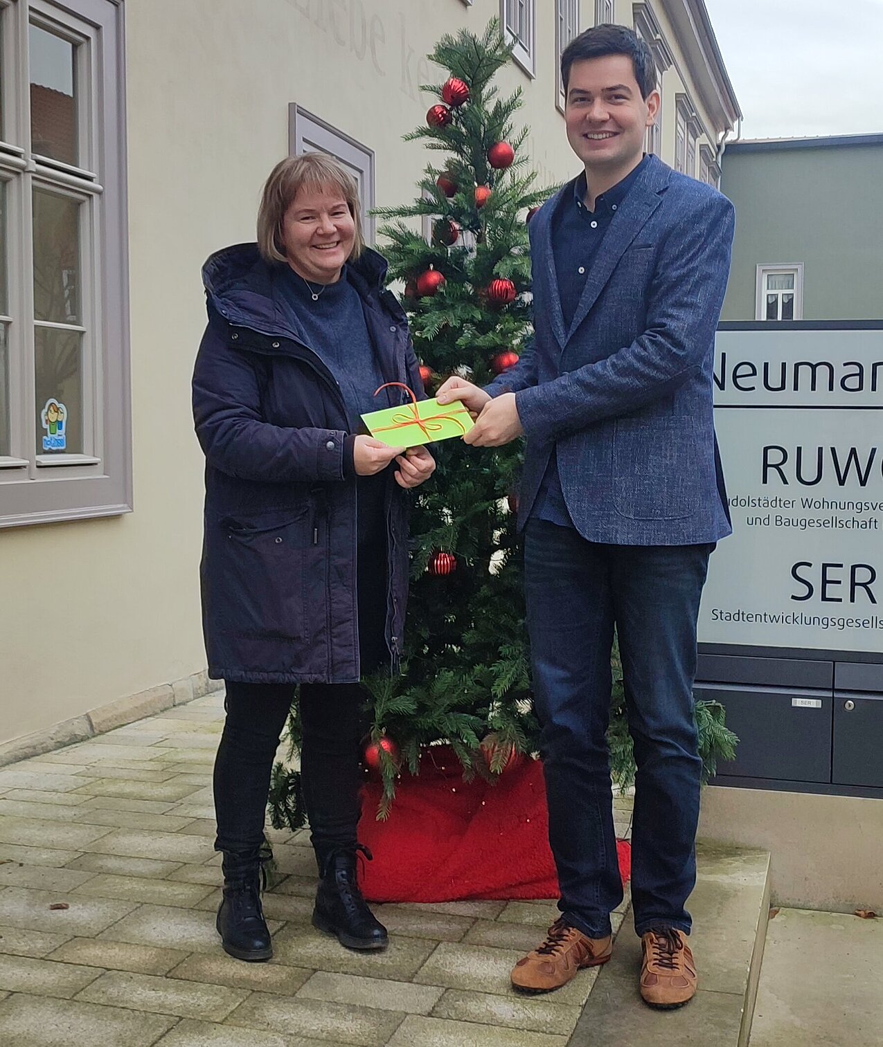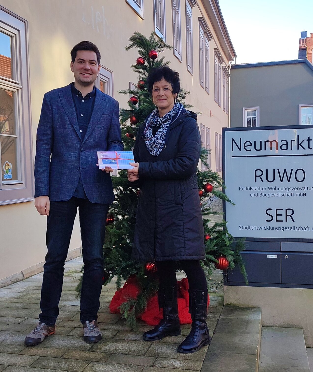 Unsere Gewinner des zweiten und dritten Preises Frau Wagner und Frau Kühn freuen sich bei der Übergabe auf ihr unverhofftes Weihnachtsgeschenk. Frau Wagner möchte den erhaltenen Gutschein für das Theater Rudolstadt nutzen, um gemeinsam mit der Familie eine der nächsten Vorstellungen zu besuchen.